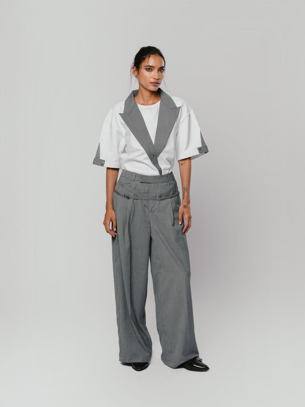 The debut collection reimagines foundational wardrobe essentials through refined construction and details, transforming the familiar into something worth noticing. Classic suiting twills, compact jerseys, crisp poplins, and rib knits intersect with overlooked everyday objects—door hinges, keys, buffed metals, and lingerie closures. Industrial and intimate worlds collide through functional trims, Trompe l’oeil details, and inside-out thinking.